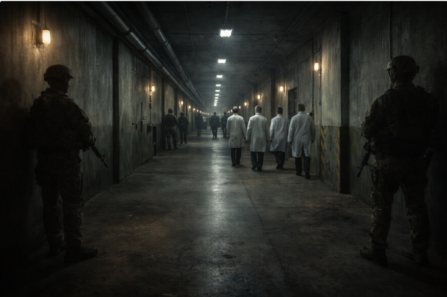 Prompt: A long underground corridor with industrial lighting, concrete walls, armed guards, and scientists walking in silence. No windows. A feeling of isolation and secrecy. Realistic, cinematic, muted tones.