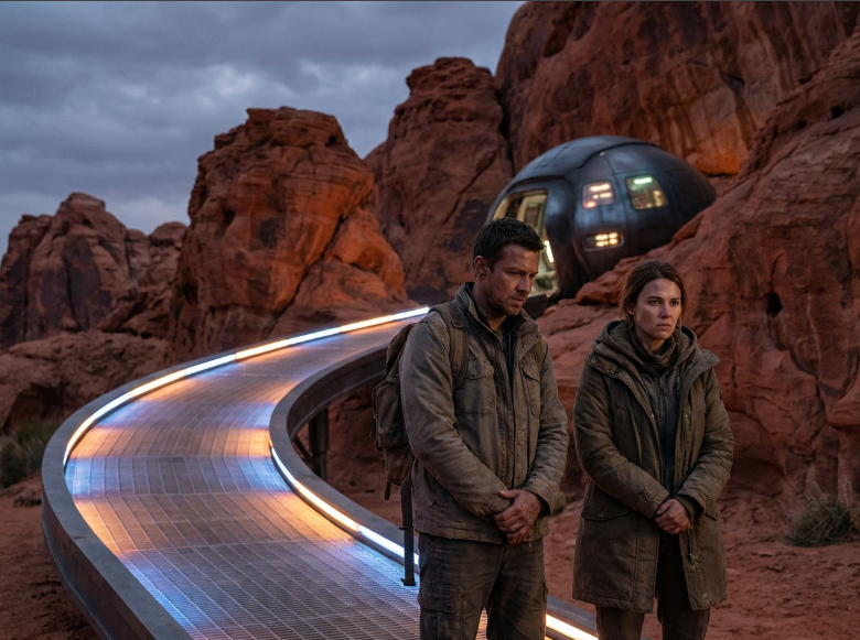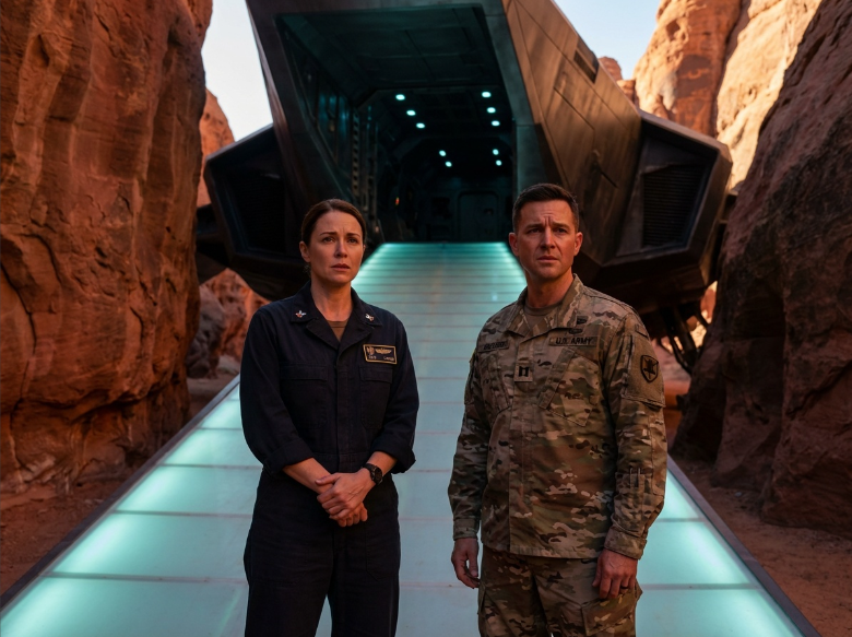 Prompt: Two human figures, a man and a woman, standing at the base of a ramp leading into an alien craft. The ramp glows softly. Their posture shows tension and resolve. Desert rock walls loom around them. Cinematic lighting, emotional realism.