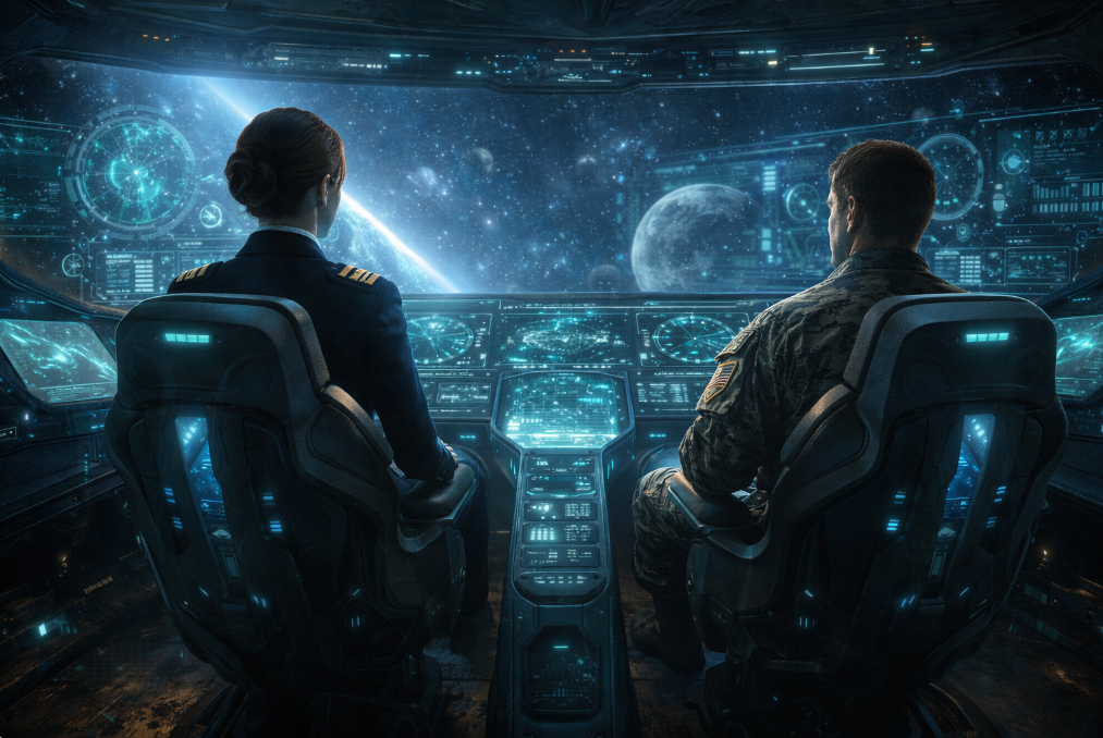 As they settled in, consoles activated and the walls came alive, forming a half-circle of monitors displaying a 365-degree panoramic view of the surrounding environment — a view that had existed even before they boarded.