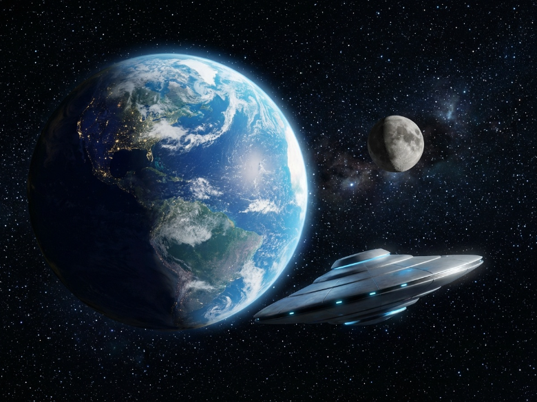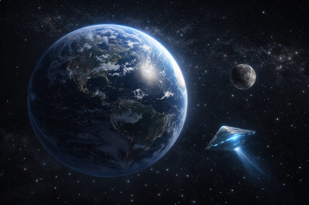 Prompt: View from space showing Earth and the Moon together, with a small alien craft rotating gently in the foreground. Stars crisp, Earth luminous. Awe-filled, photorealistic space imagery.