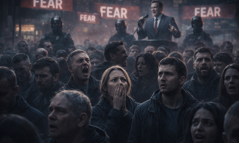 Fear is the engine that allows this transformation to proceed without resistance. Under sustained fear, complexity becomes intolerable. People seek certainty, even at the expense of accuracy. Nuance feels unsafe. Questions feel subversive.
