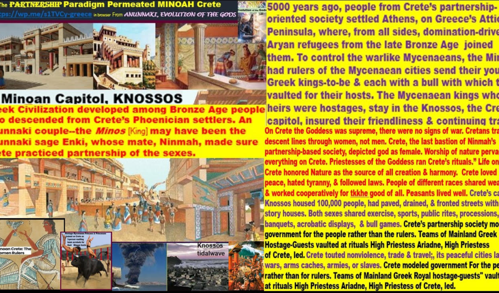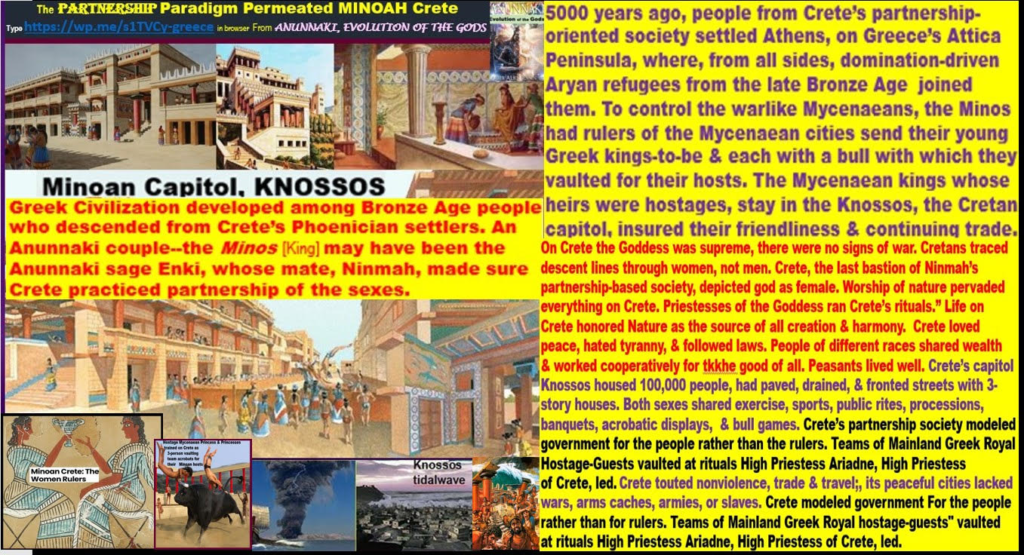 Greek civilization developed among Bronze Age people descended from Crete’s Phoenician settlers. An Anunnaki couple–the Minos [King] may have been the Anunnaki sage Enki, whose mate, Ninmah, made sure Crete practiced partnership of the sexes.