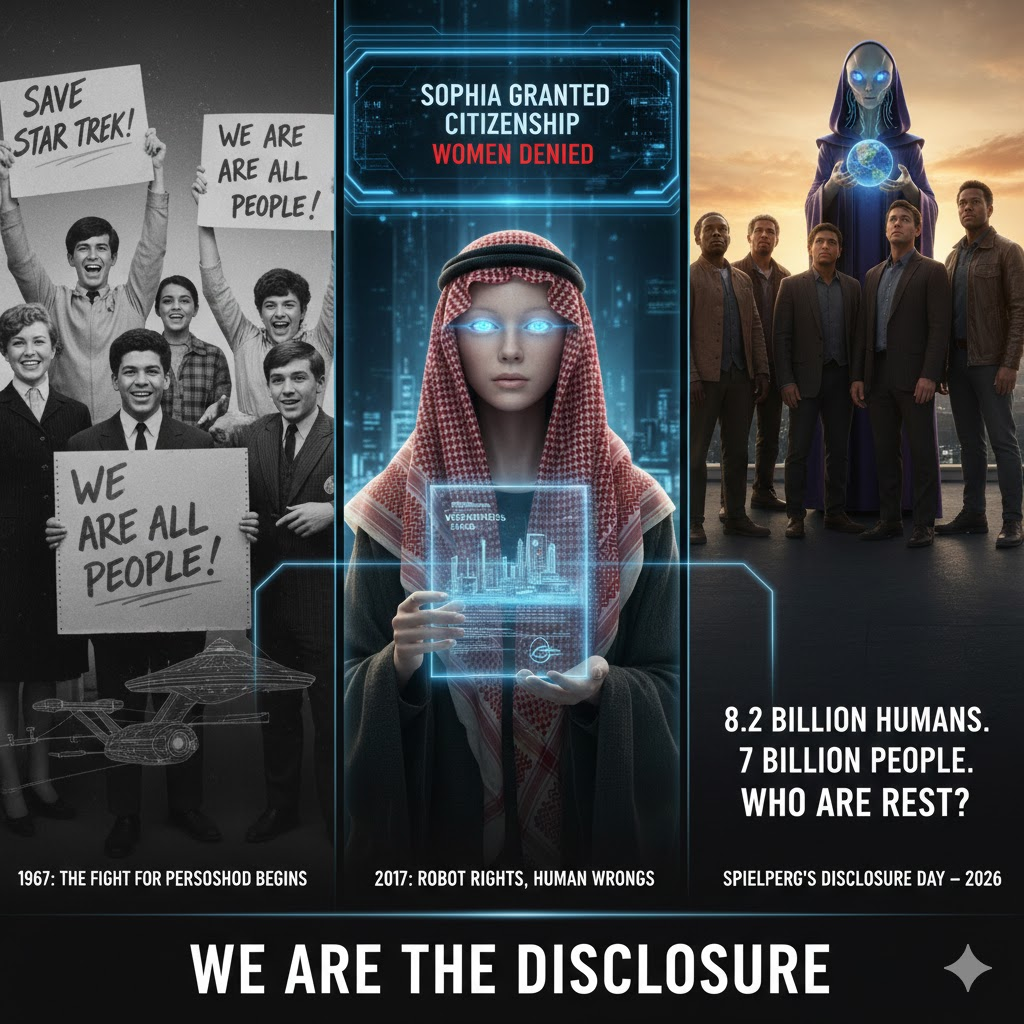 - The Infographic: A “Timeline of Personhood” starting with the Save Star Trek logo (1967), moving to Sitchin’s Sumerian translations, the Sophia Robot (2017), and ending with the Disclosure Day poster (2026).