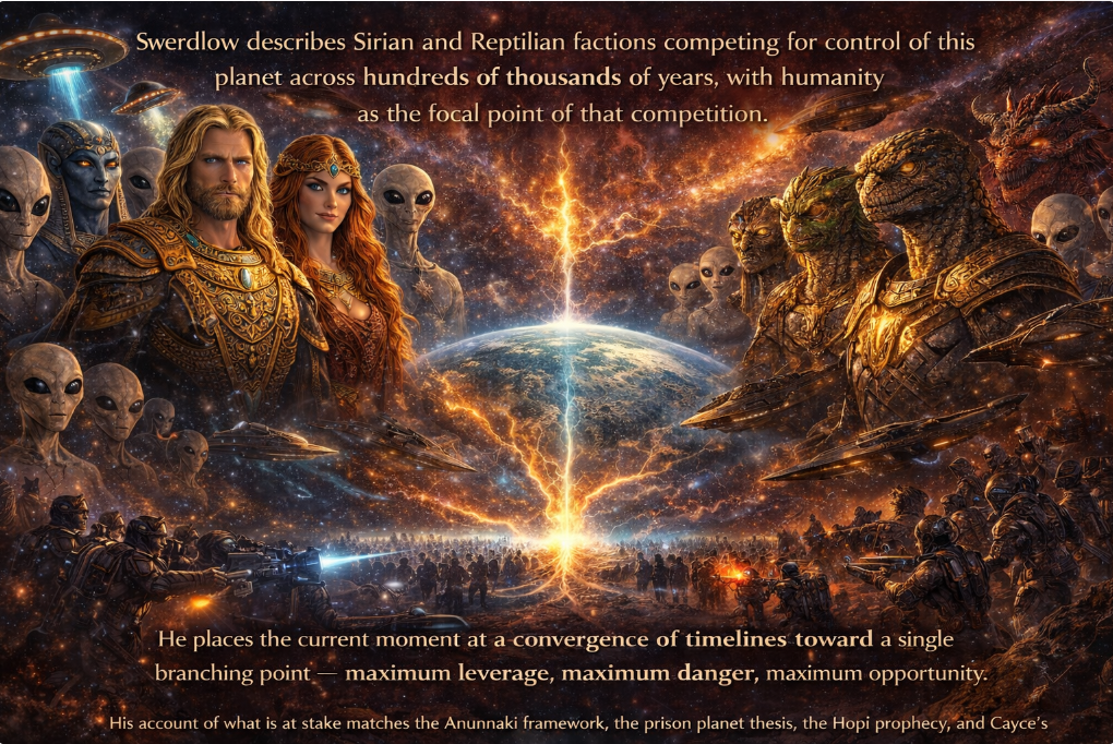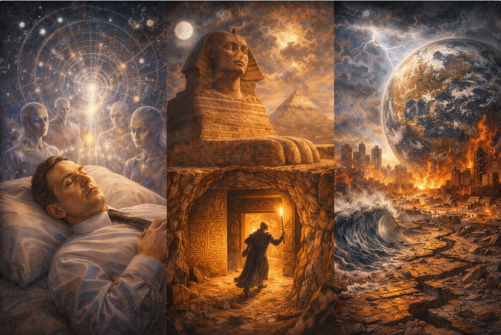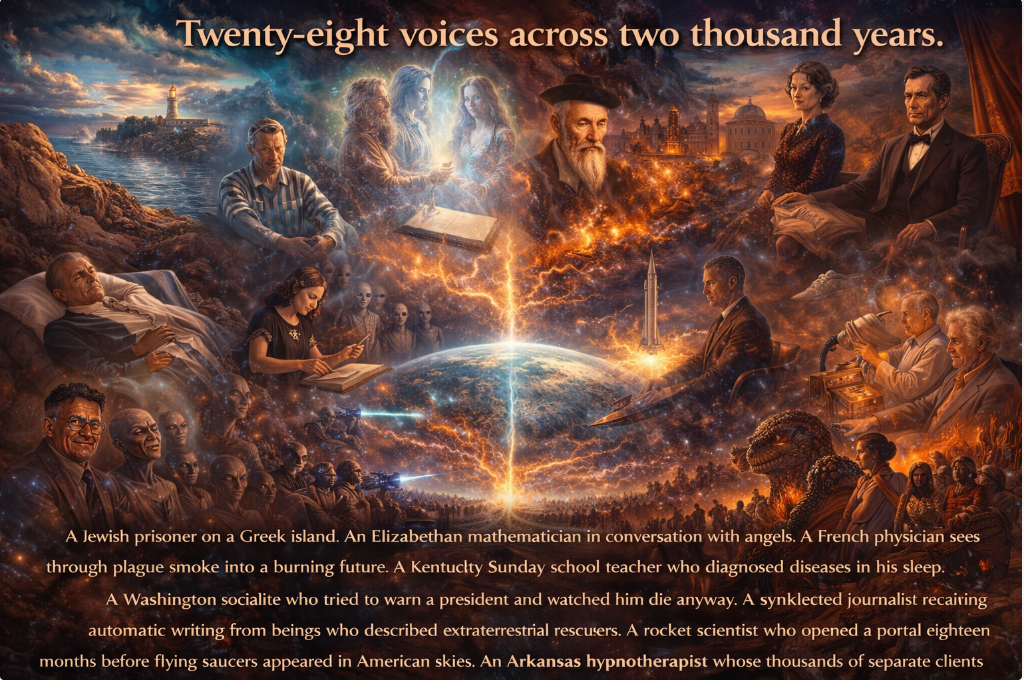 Across two thousand years, in a dozen traditions, on six continents, receivers — mystics, mathematicians, sleeping prophets, rocket scientists, hypnotherapists, mediums, shamans, and channelers — all identified the same window. Some received from benevolent cosmic beings trying to warn and prepare humanity. Some received from controlling forces trying to shape the outcome. A few received from both at once, with no way to separate the streams. All of them recorded what is happening now, and all of them recorded it before it arrived.