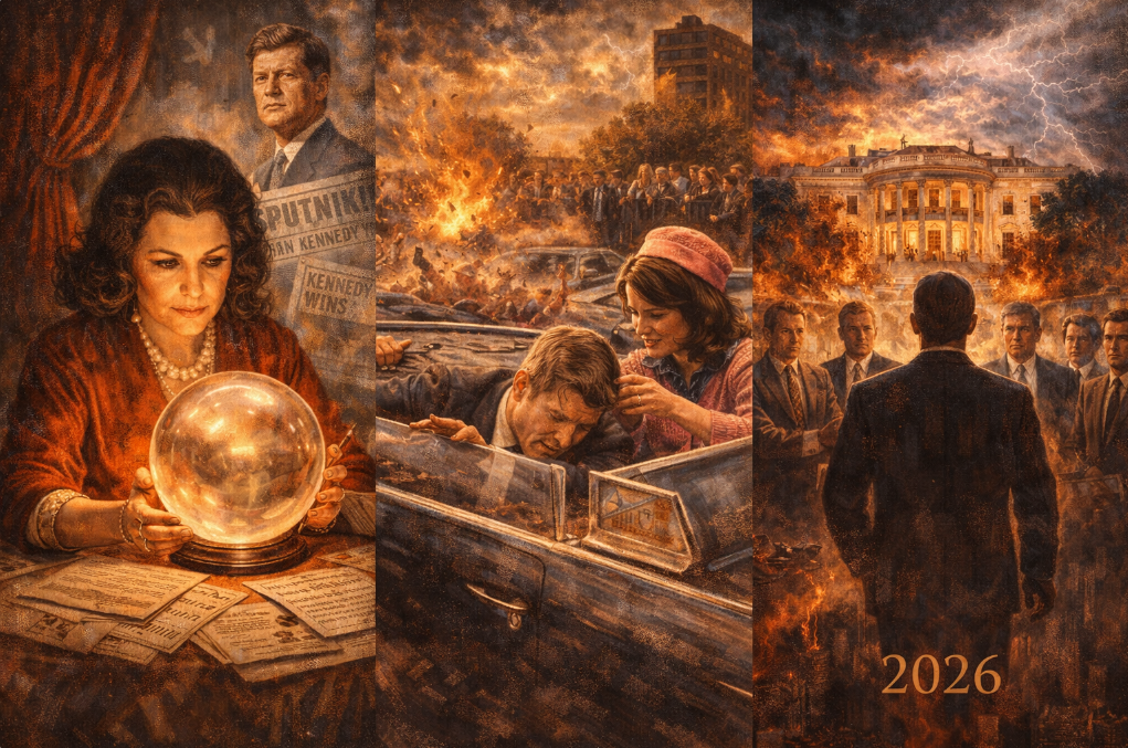 Jeane Dixon gave accurate psychic readings to Washington politicians, presidents, and power brokers for five decades. Her 1952 vision — published in Parade magazine in 1956 — predicted that a blue-eyed Democrat elected president in 1960 would die in office, assassinated. Kennedy won in 1960. Dallas happened in 1963. Dixon had tried to warn him.