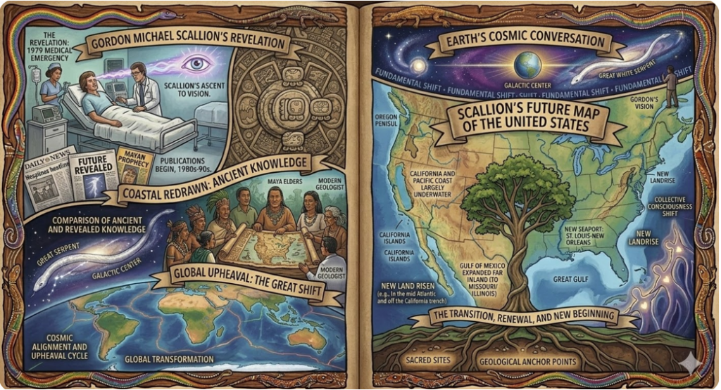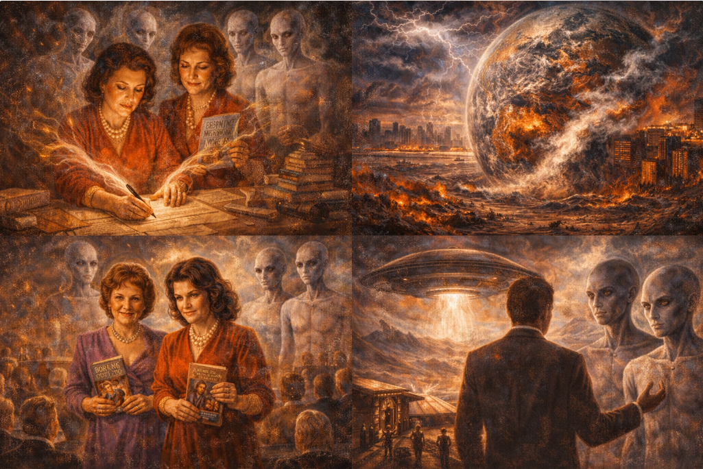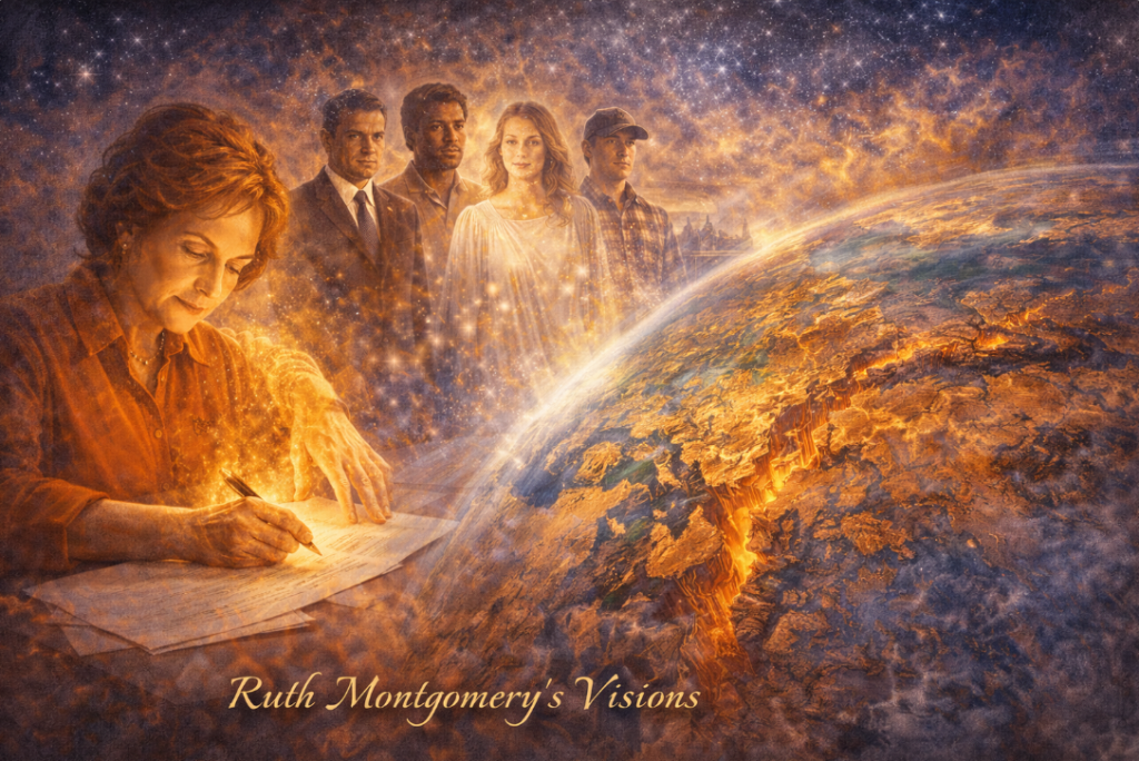 Through automatic writing — the hand moving across the page guided by something other than conscious intent — Montgomery received communications from beings she called the Guides. Over fifteen books across three decades, she published their content. The Guides described benevolent extraterrestrial beings living among humans in human form, assigned to assist humanity through a coming crisis. They described a coming axial shift that would reshape continents. They described the walk-in phenomenon — an advanced soul entering a living human body when the original occupant departs, carrying the body’s identity and memories but a higher mission. They placed the window of maximum transformation in the early twenty-first century.