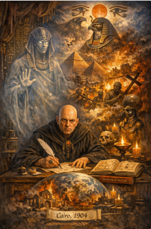 In April 1904 in Cairo, a being identifying itself as Aiwass, messenger of Ra Hoor Khuit, dictated three days of text to Crowley. The Book of the Law declared the end of the Aeon of Osiris — the age of the dying and resurrecting god, of Christianity’s moral framework — and announced the Aeon of Horus. Crowley called it the Aquarian Age and said its birth required global trauma.