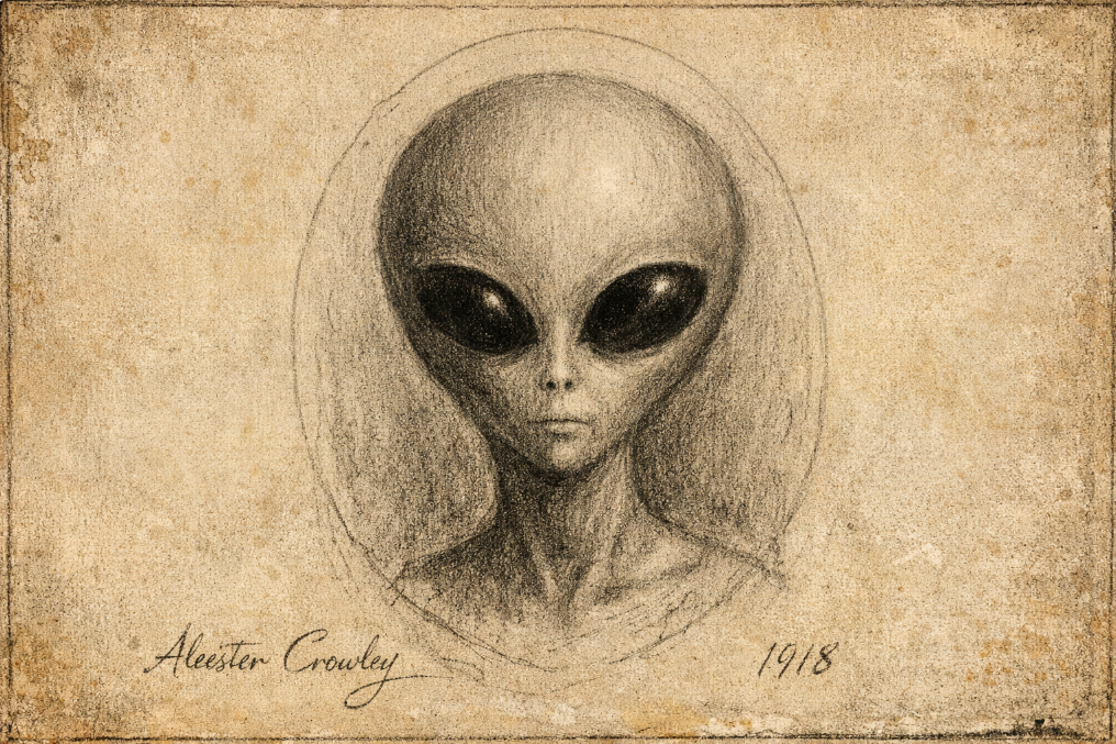 In 1917 and 1918 in New York City, Crowley conducted the Amalantrah Working. A being named Lam came through. He drew its portrait: a large, hairless head, enormous black eyes, a tiny nose and mouth, and a slight, elongated body. The portrait is unmistakably that of a Grey alien. Crowley drew it in 1918. Roswell was in 1947. The Greys predate the crash.