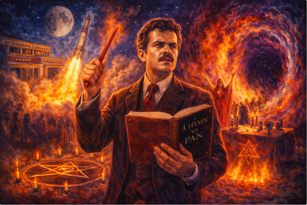 John Whiteside Parsons co-founded the Jet Propulsion Laboratory and Aerojet Engineering Corporation. The solid rocket propellant he developed put the Space Shuttle in orbit and the Minuteman missile in its silo. The Moon’s far side carries a crater bearing his name. He also recited Crowley’s Hymn to Pan before rocket tests, ran an occult commune from a Pasadena mansion called the Parsonage, and in January 1946 began a series of ritual workings designed to open a dimensional portal.