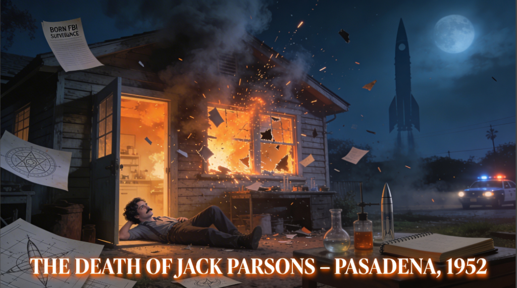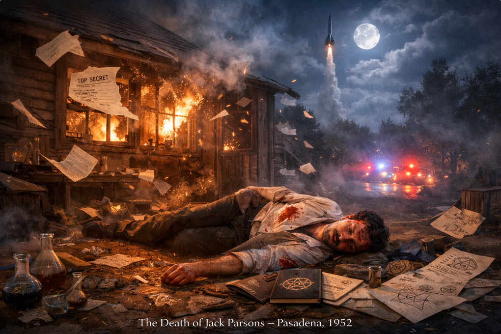 Parsons died in June 1952 in an explosion at his home laboratory. He was thirty-seven. The official cause was the mishandling of fulminate of mercury. By then, the FBI had targeted him, stripped his security clearance, and noted his public discussions of the occult-aerospace connection. The convenient death pattern running through this entire series also affects Parsons.