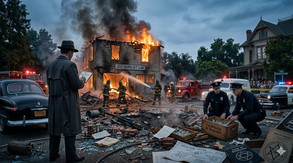 The official record maintains that on June 17, 1952, Parsons was rushing to finish an explosives order for a movie set before moving to Mexico with Marjorie Cameron. While mixing a batch of mercury fulminate in his home laboratory (a converted coach house), a coffee can allegedly slipped from his hands.