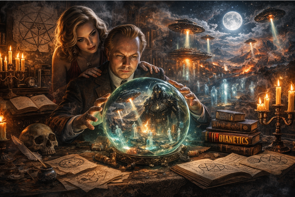 Less examined is what Hubbard encoded inside Scientology. Dianetics describes the mind as containing traumatic memories called engrams that block full awareness. Auditing removes engrams toward a state called Clear. In the confidential upper levels, accessible only after paying hundreds of thousands of dollars, Hubbard described the full prison planet cosmology: Earth’s population consists of immortal spiritual beings called Thetans, trapped here by an ancient galactic tyrant named Xenu, subjected to false memory implantation at locations called implant stations, and held in amnesia that prevents them from recognizing their own nature.