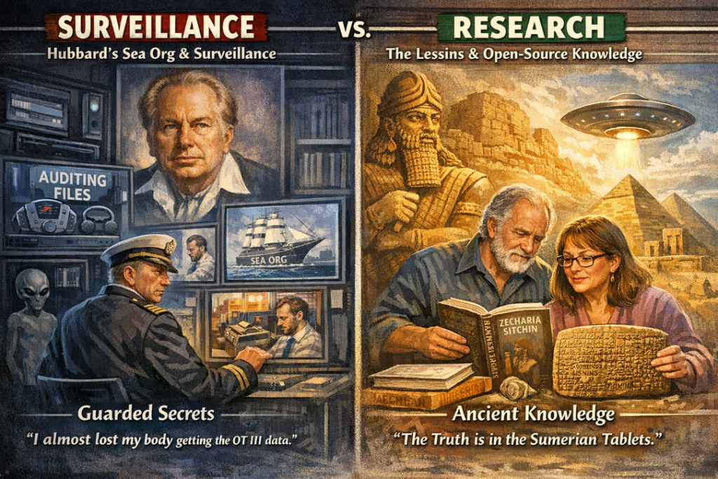 - Surveillance vs. Research: While the Lessins advocate for open-source “Ninmah consciousness” and the release of suppressed archaeological data, Hubbard’s organization famously uses internal surveillance (the Sea Org and auditing files) to protect the proprietary nature of these “secrets.”