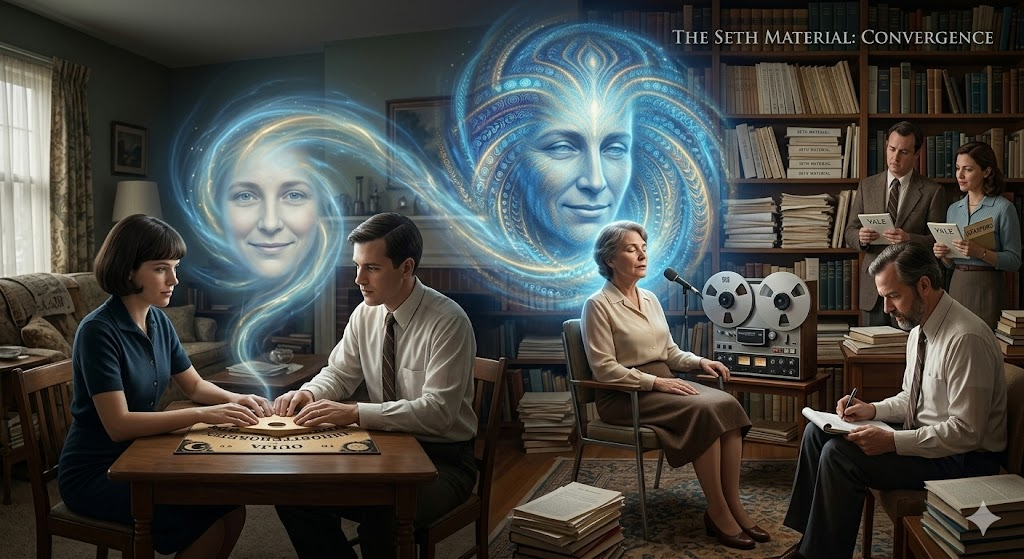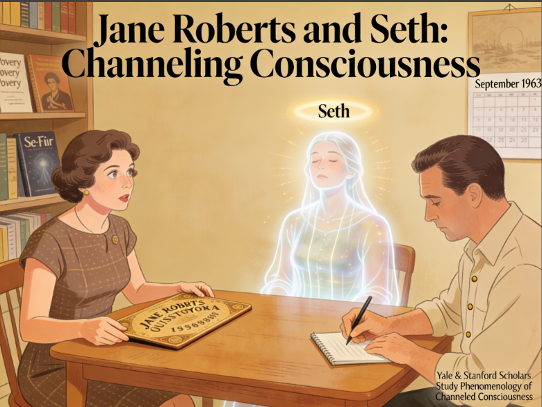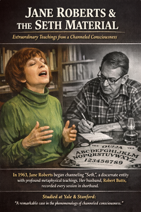 Jane Roberts was a poet and science fiction writer in Elmira, New York, who picked up an Ouija board in September 1963 out of curiosity. A personality calling itself Seth began communicating through her with increasing force and clarity. Within weeks, she channeled Seth directly in full trance, her husband Robert Butts recording every word in shorthand. Over the next twenty years, Seth produced a body of philosophical and metaphysical teaching so internally consistent, so psychologically sophisticated, and so far beyond Roberts’ education that scholars at Yale and Stanford studied it as a serious case in the phenomenology of channeled consciousness.