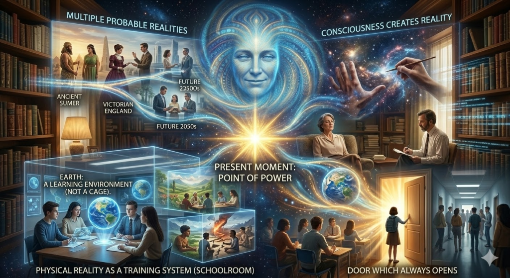 Seth taught that consciousness creates reality, that time runs simultaneously rather than linearly, that multiple probable realities coexist, and that the present moment is the only genuine point of power. He described physical reality as a training system — a schoolroom in which consciousness develops by experiencing the consequences of its own creations. Earth, he said explicitly, is a learning environment, not the permanent home of the beings inhabiting it.