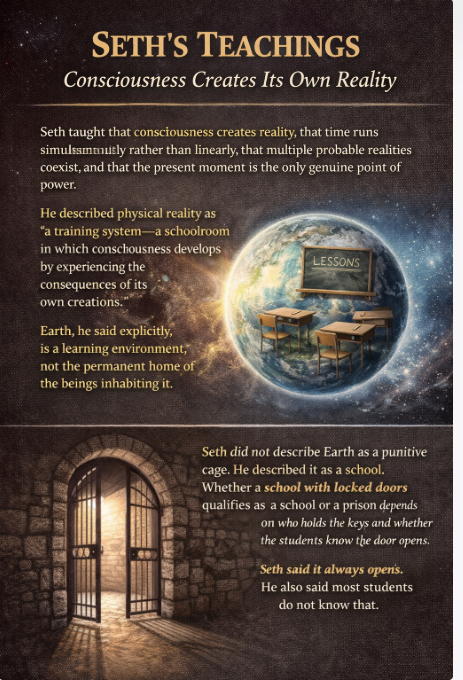 Seth did not describe Earth as a punitive cage. He described it as a school. Whether a school with locked doors qualifies as a school or a prison depends on who holds the keys and whether the students know the door opens. Seth said it always opens. He also said most students do not know that.