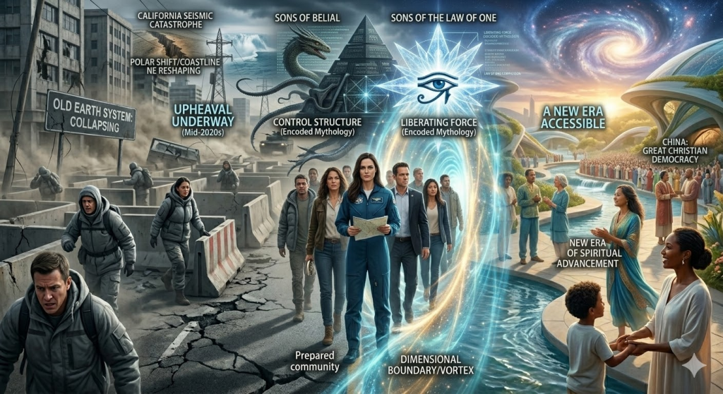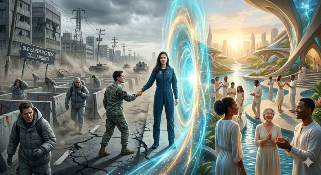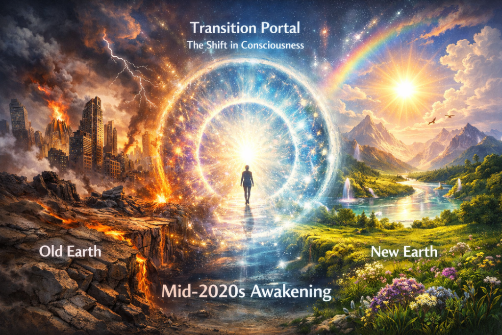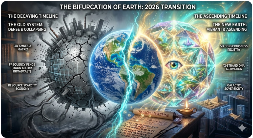 - The Dimensional Split (New Earth): A representation of Earth splitting into two overlapping spheres—one dense, grey, and collapsing (the old system); the other vibrant, crystalline, and ascending (the New Earth).