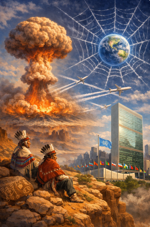 - The Hopi Signs of Purification: A collage showing the four signs: the “gourd of ashes” (atomic cloud), the “spider’s web” (global fiber optics), “roads in the sky” (jet contrails), and the “house of mica” (UN Building).
