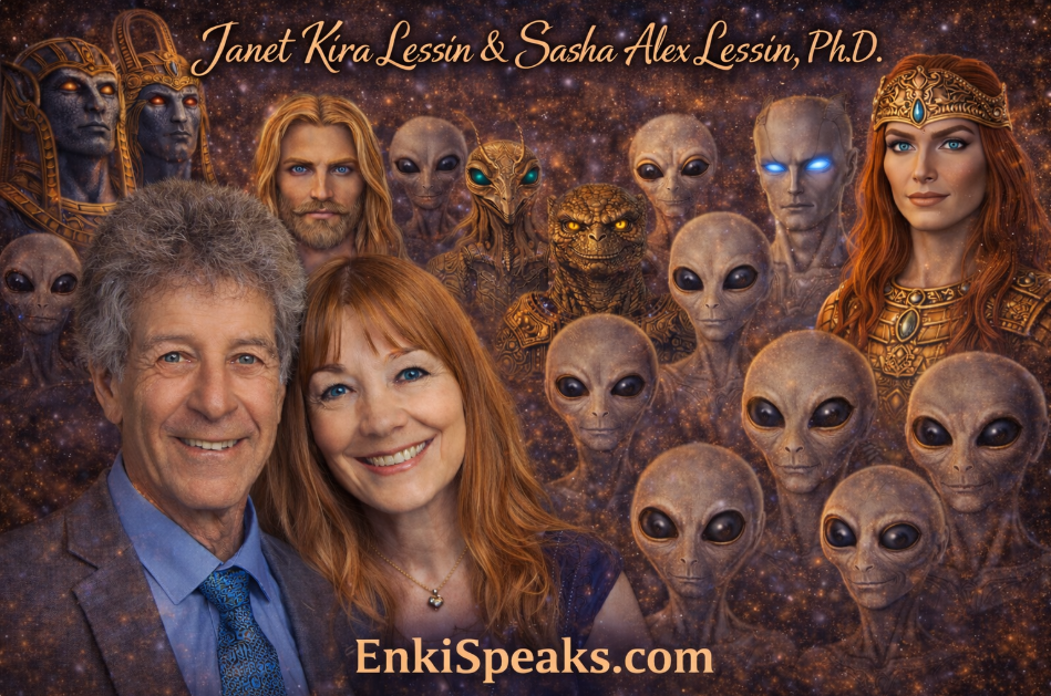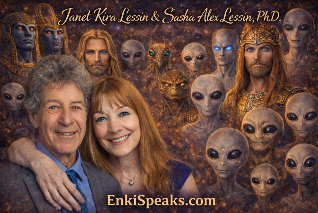 Janet Kira Lessin is CEO of Aquarian Media and a consciousness researcher, broadcaster, and lifelong experiencer who studied directly with Zecharia Sitchin from 1998 to 2010. Sasha Alex Lessin, Ph.D., holds a doctorate in Anthropology from UCLA and practiced as a clinical hypnotherapist for decades before turning his full scholarly capacity toward the hidden history of humanity. They live on Maui with their three cats: Furball, Mocha, and Athena. Research co-authorship: Claudia Lenore.