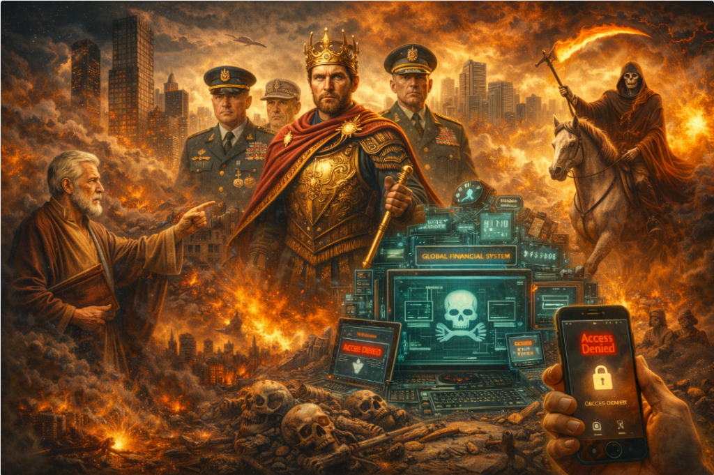 John described the Whore of Babylon not as a woman or a religion but as a system — seated on many waters, clothed in purple and scarlet, drunk with the blood of the saints. He described a Beast whose number — six hundred sixty-six — scholars have connected to Roman emperors, barcodes, RFID chips, and the global financial control architecture. He described a war so vast that armies from every nation on Earth gather in a valley called Armageddon. He described a rider on a white horse descending from the sky with eyes like flames and a name no one knew but himself.