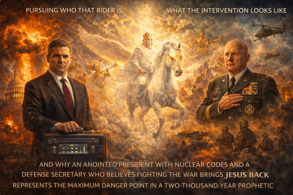 The work investigates the convergence of religious apocalyptic frameworks, nuclear command authority, and global power systems — and what those forces may mean for the future of civilization.