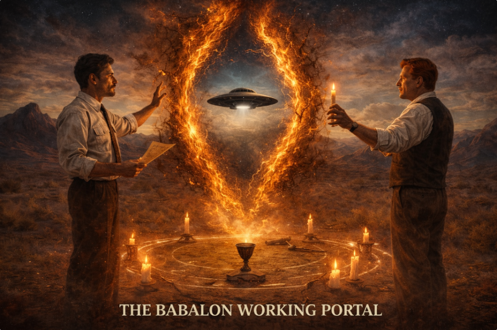 - Prompt Tags: Jack Parsons, L. Ron Hubbard, Babalon Working, 1946 ritual, desert night, dimensional portal, flying saucer silhouette, occult, pulp noir aesthetic.