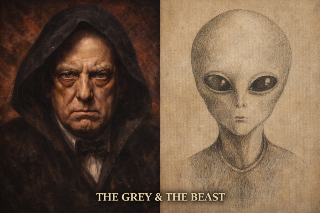 - The Grey & The Beast: A portrait of Aleister Crowley juxtaposed with his 1918 drawing of “Lam,” showing the unmistakable evolution into the modern “Grey” alien archetype.