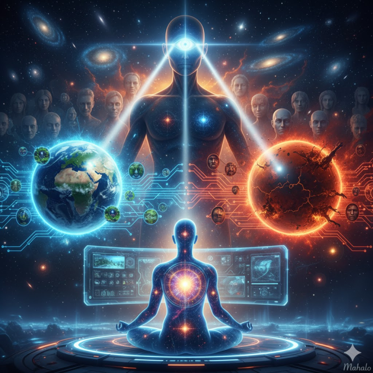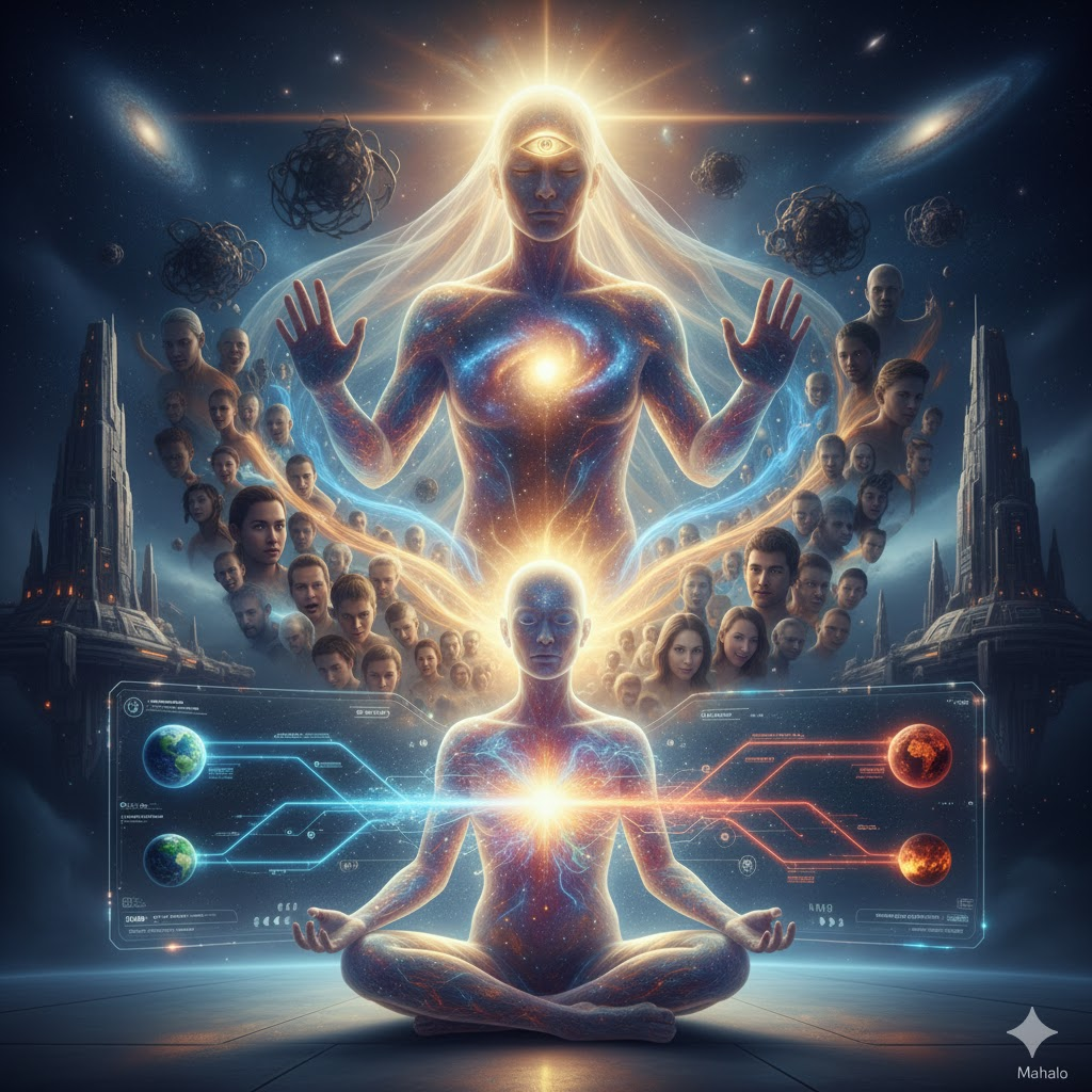 Emerging from this point of contact is a complex, holographic flowchart that I include with this post, which shows the “IF-THEN” logic paths. To the right, the path labeled “I’M INDEPENDENT” acts as a semi-transparent shield that the soul hides behind. However, the energy lines bypass the shield, revealing the actual runtime consequences: collapsing ecosystems, the unraveling of the DNA of science, and the looming shadow of global conflict. In the background, multiple faint heads represent the “Council” or “Soul Group” witnessing the execution of these choices across the continuum.