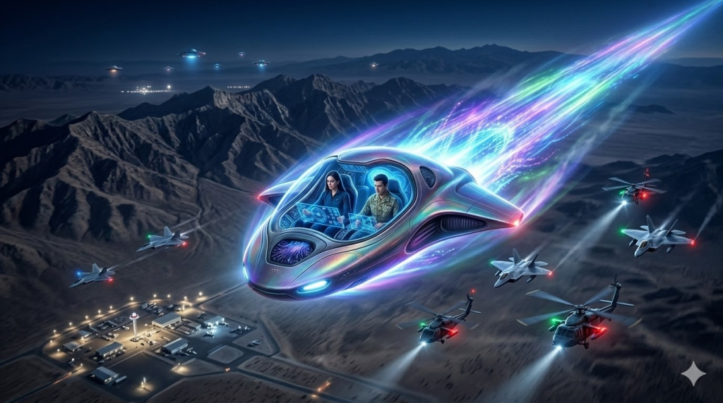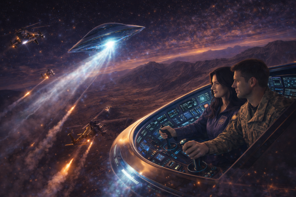 Through the transparent canopy, the desert landscape of Area 51 glows below while multiple UFOs hover in the night sky.