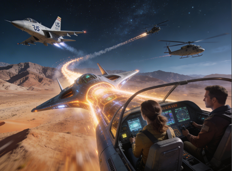 The sentient extraterrestrial craft GUS streaks into the night sky above desert mountains while U.S. military jets and helicopters pursue it.