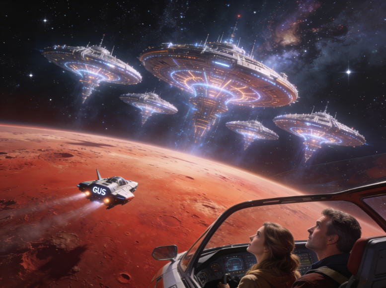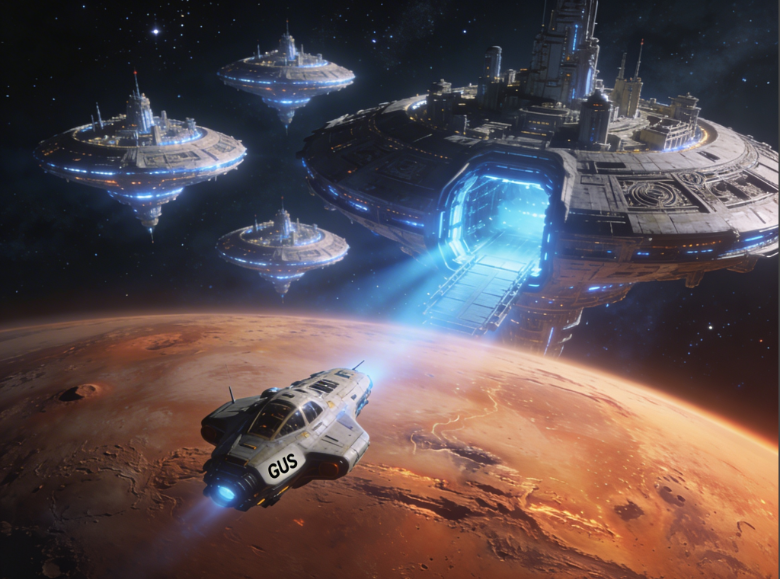 The extraterrestrial craft GUS approaches a gigantic mothership near Mars.
