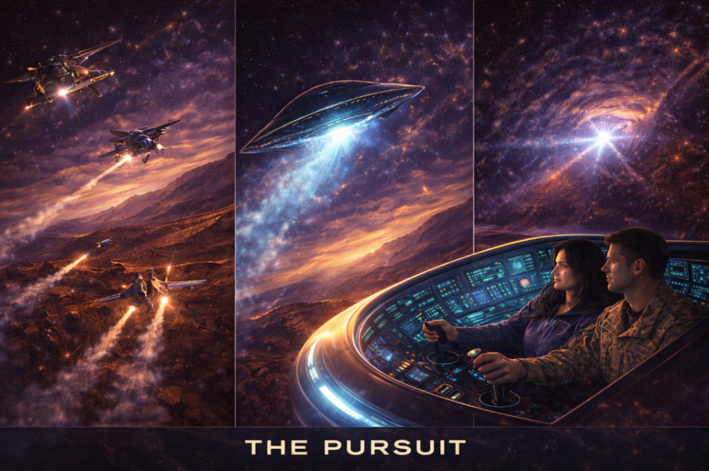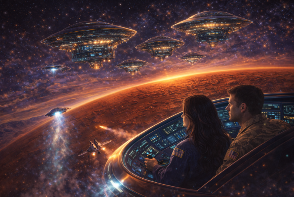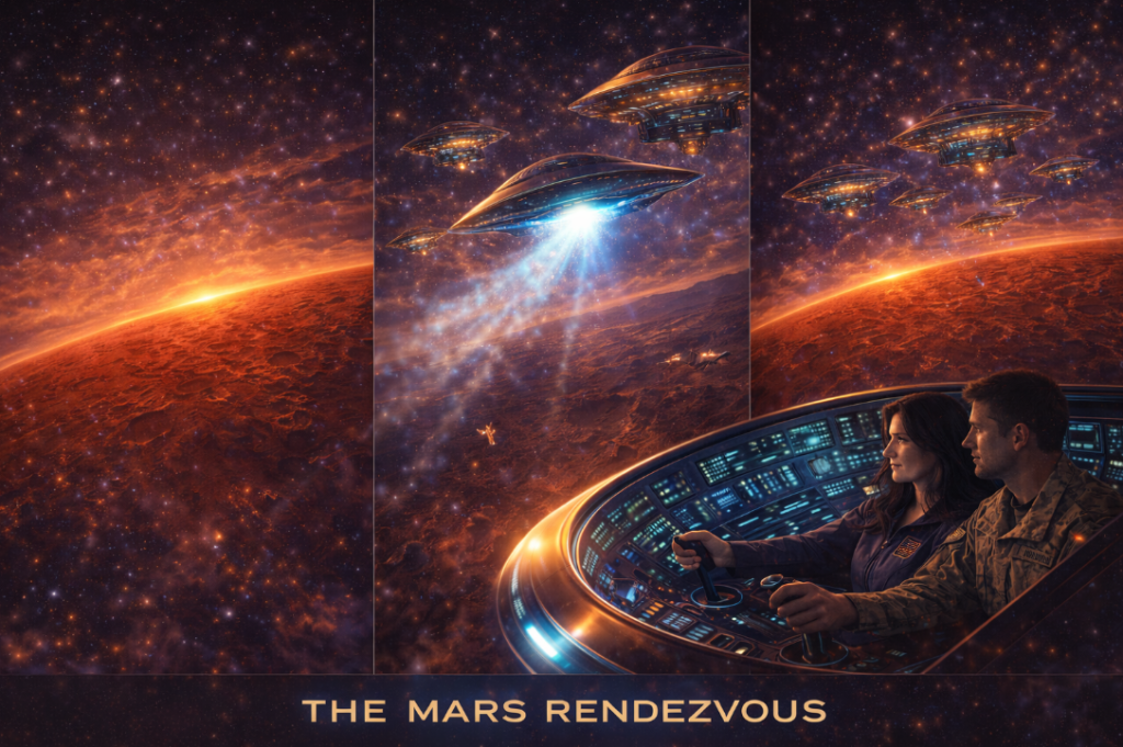 Theresa Morris sits at the controls of the sentient extraterrestrial craft GUS (Galactic Universal Ship) while Tom Morris assists beside her. Several calm Grey extraterrestrials stand behind them observing. Through the craft’s transparent canopy, the desert landscape and the secret military installations of Area 51 glow below, while several UFOs hover in the sky.