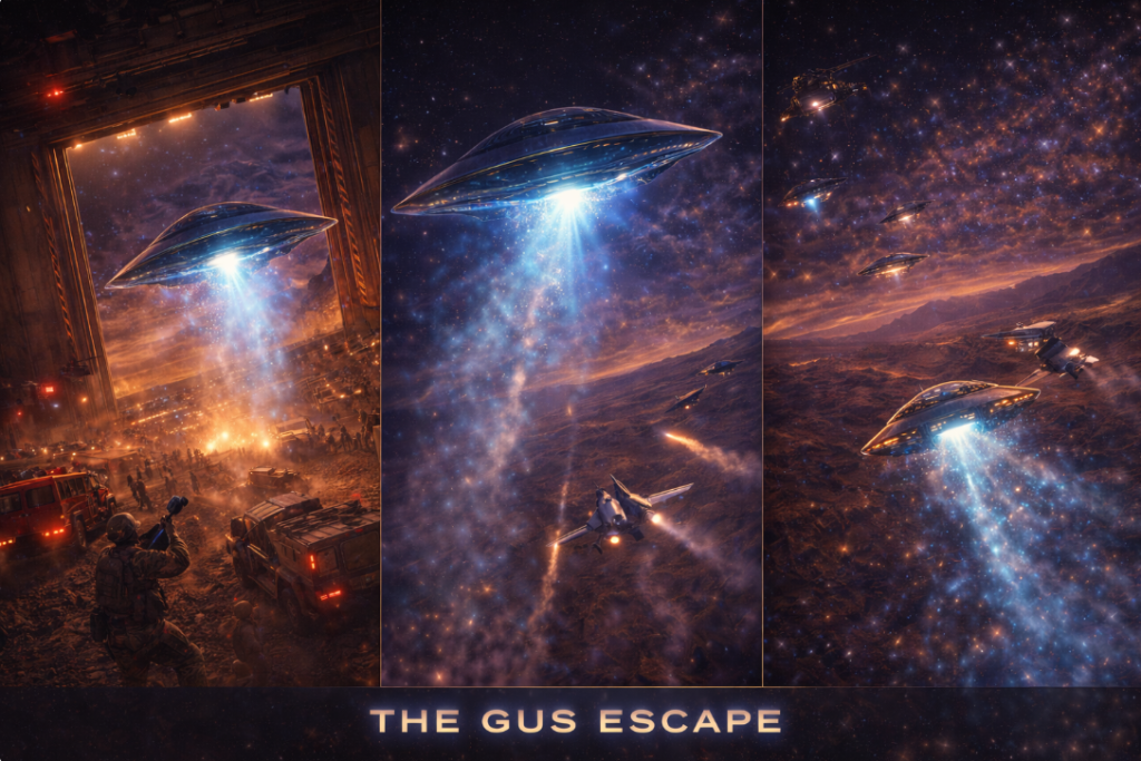 Inside a hidden mountain base, the sentient craft GUS lifts off from a massive underground hangar while military vehicles and aircraft scramble to stop the escape. Theresa pilots while Tom monitors systems as alarms flash around them.