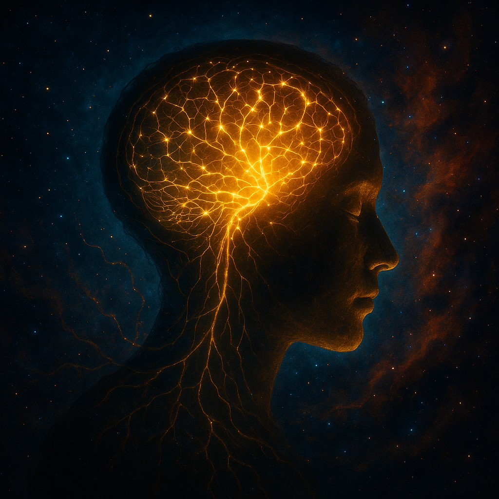 A luminous human profile floats in a cosmic expanse, eyes gently closed in serene awareness. Golden neural pathways radiate through the brain and down the spine like living roots of light, connecting the mind to the vastness of space. Each glowing strand pulses with intelligence and feeling, echoing the concept of a “seity”—a sovereign node of universal consciousness. This image captures the profound tension between individuality and unity, intelligence and intuition, portraying consciousness as both rooted in the body and expansive across the stars.