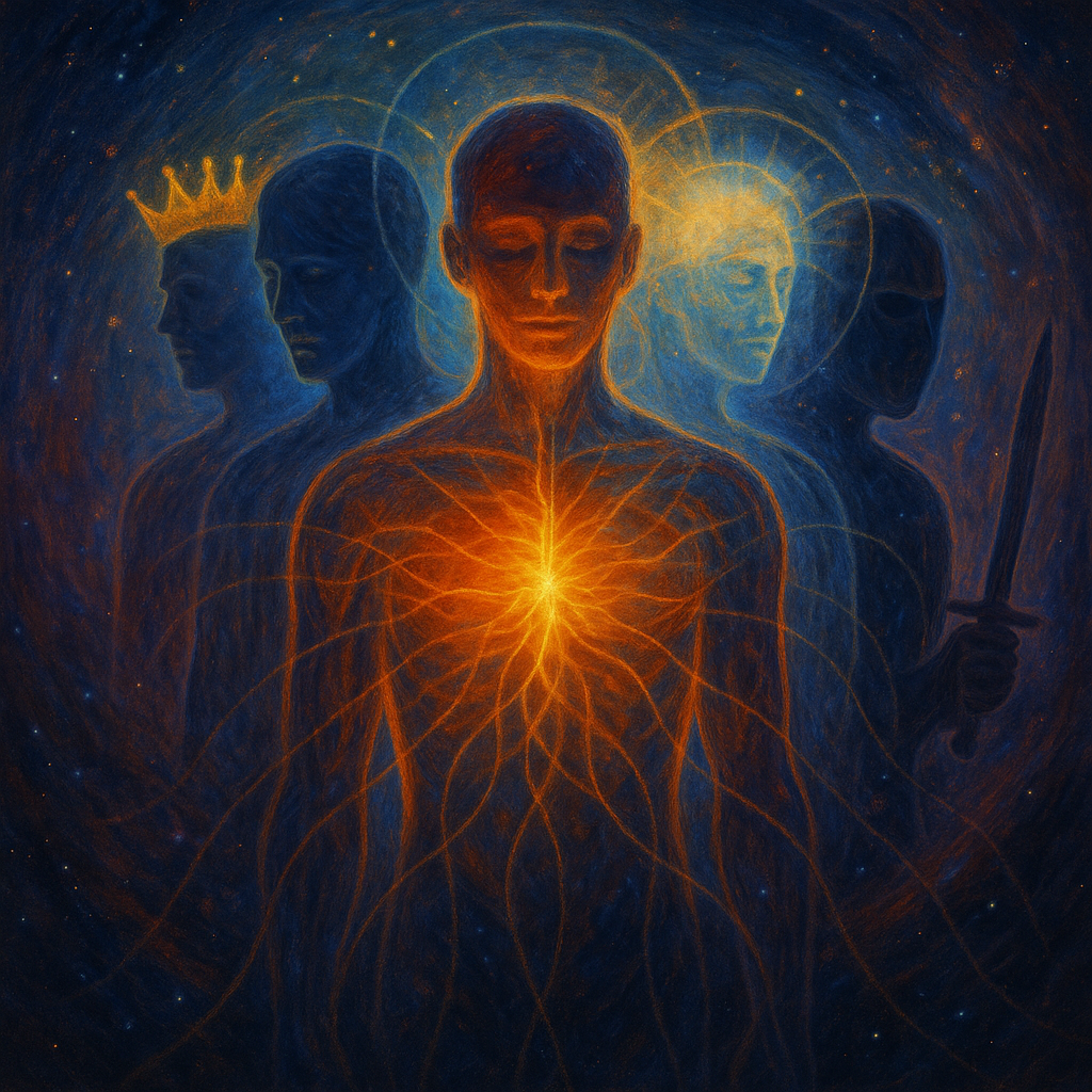 A single human figure split into layers—each transparent and vibrating at a slightly different frequency. One layer holds a crown, another wears a mask of sorrow, another radiates with light, and another holds a sword. All are connected by a glowing central soul at the heart. Behind them, shifting timelines and dimensions swirl, showing the fluidity of becoming.