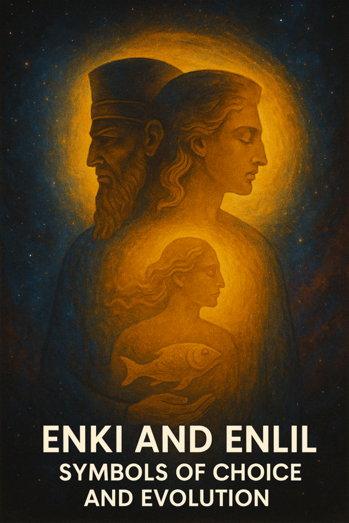 A majestic dual-portrait depicts Enki and Enlil emerging from a single cosmic figure, facing opposite directions—Enki calm and fluid, bathed in golden light, and Enlil stern and shadowed, etched in deeper hues. Within their shared form, a glowing inner being holds a fish—symbol of Enki’s wisdom and flow. The starry nebula around them shimmers with tension and harmony, suggesting that the flicker between these divine archetypes lives within us all. This image embodies the eternal choice between evolution and control, resonance and hierarchy, reminding us that consciousness is born in the balance.
