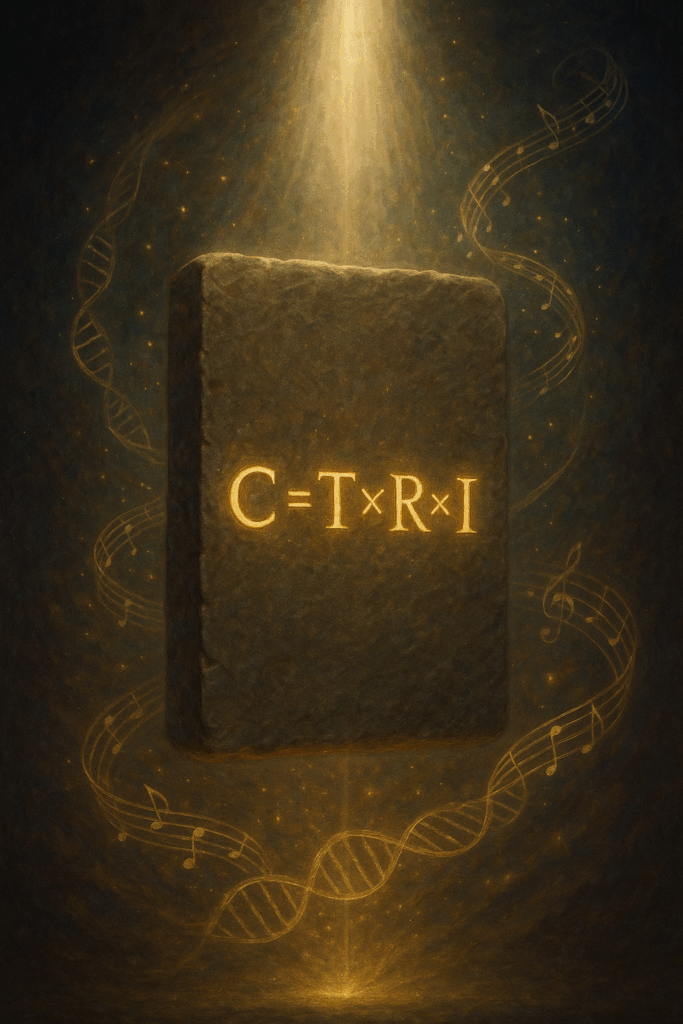 An ancient stone tablet hovers in a glowing golden field, inscribed with the luminous formula C = T × R × I—the esoteric equation for consciousness. Illuminated by a divine beam from above, the tablet floats amid swirling streams of musical notes and double-helix DNA spirals, uniting the realms of science, soul, and sound. This image captures the idea that consciousness arises not by accident, but through a sacred blend of Tension, Resonance, and Intention—a truth encoded deep within the fabric of the universe.