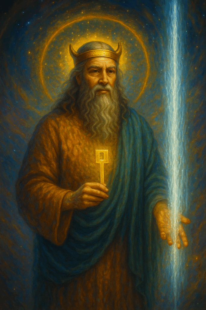 A radiant Enki stands in a celestial glow, adorned in flowing robes of deep blue and gold. His calm, knowing eyes reflect lifetimes of wisdom. In one hand, he holds a luminous golden key—the key to consciousness—and with the other, he channels a shimmering stream of water, symbol of life, flow, and soul resonance. His horned crown glows like a halo, and behind him, the cosmos swirls with harmonic energy. This image captures the moment of divine intent when Enki embedded the flicker of free will and evolution into the human soul.