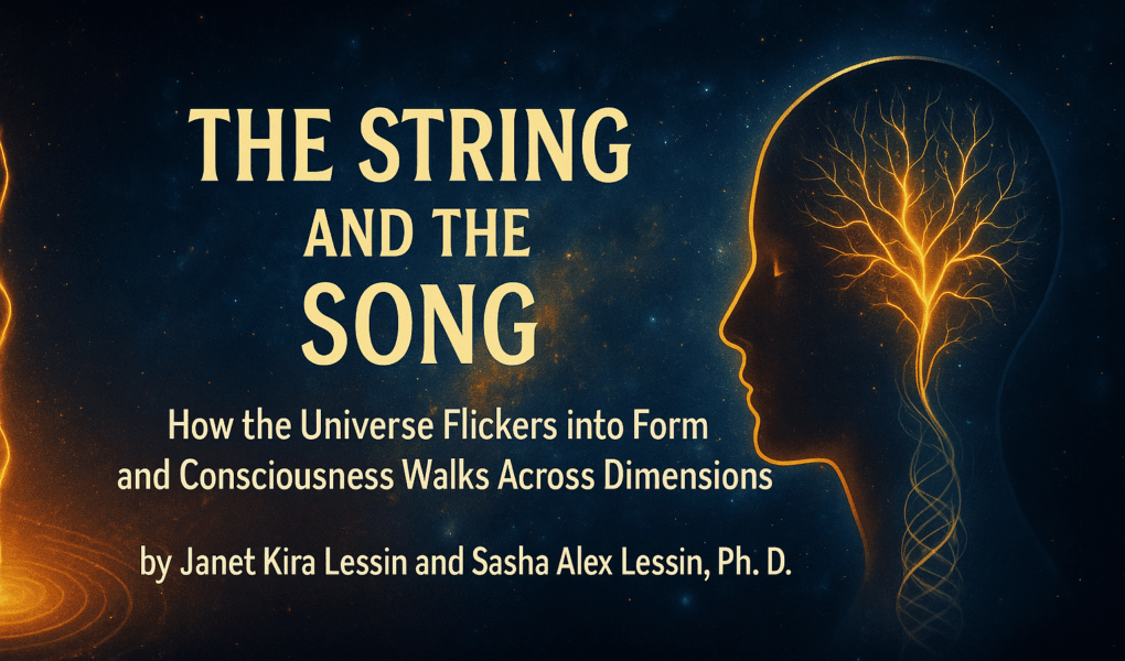 A luminous banner for the feature article “The String and the Song” stretches across a cosmic backdrop, where starlight twinkles over deep blues and golds. On the left, a glowing string ripples outward like a primordial vibration. On the right, the profile of a human head glows with a golden neural tree—representing consciousness flowering from tension and resonance. In the center, the article’s full title and authors—Janet Kira Lessin and Sasha Alex Lessin, Ph.D.—are illuminated in soft light, uniting science, soul, and the infinite mystery of becoming.