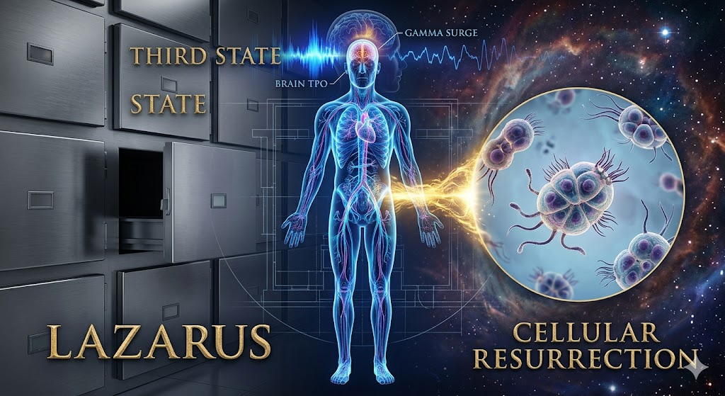 [Image_0: Generative Image Prompt] A cinematic, complex collage visual that serves as a summary of the entire article. The central image is a high-contrast, professional medical illustration of a human body in transition—a glowing, iridescent digital blueprint showing neural pathways and the heart. A vibrant, golden ‘bridge of light’ connects this body to a microscopic inset showing human lung cells self-assembling into mobile biobots. Surrounding this center, various conceptual layers merge: the background transitions from a clinical morgue drawer on one side to a starry, consciousness-expanding cosmic background on the other. Woven throughout are subtle, abstract representations of brainwaves (the ‘gamma surge’), a faint outline of the “DNR-to-Donor pipeline” architectural plan, and stylized text elements reading ‘THIRD STATE,’ ‘LAZARUS,’ and ‘CELLULAR RESURRECTION.’ The overall tone is sophisticated, slightly eerie, and deeply reflective. (Style: Cinematic, highly detailed, high-contrast illustration.)