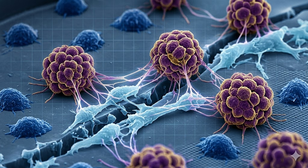 [Image_1: Generative Image Prompt] A high-resolution, false-color scanning electron microscope (SEM) capture, presenting a close-up visualization of human anthrobots. The image details solitary human lung cells spontaneously coalescing into intricate, spherical, multicellular forms. These miniature “biobots” are actively weaving together broken neural tissue, bridging the gap across a surface that resembles a petri dish. The aesthetics are sleek and professional, using vibrant blues, deep purples, and rich golds to differentiate the cells from the synthetic repairing process. (Style: High-resolution scientific SEM visualization with false-color enhancement.)
