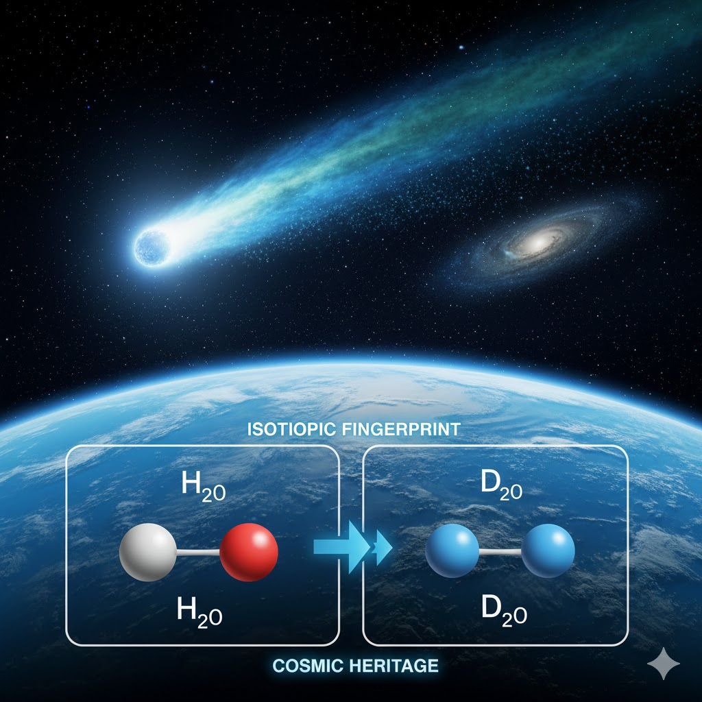 - Prompt: A dramatic scientific visualization showing a large comet (Hartley 2) entering Earth’s upper atmosphere, trailing a mist of icy particles. In the foreground, the curve of the Earth shows a deep blue ocean. A split-screen effect on the side shows a chemical diagram of a water molecule ($H_2O$) and a heavy water molecule ($D_2O$), highlighting the shared isotopic fingerprint between the comet and the sea. Realistic, educational aesthetic.