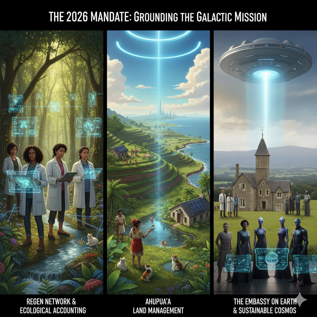 Our latest article explores the history of diplomatic protocols—from early contactee cases to the current 2026 Mandate—and how we are using the Regen Network and the Ahupua’a land management model to create a “Sustainable Cosmos.”