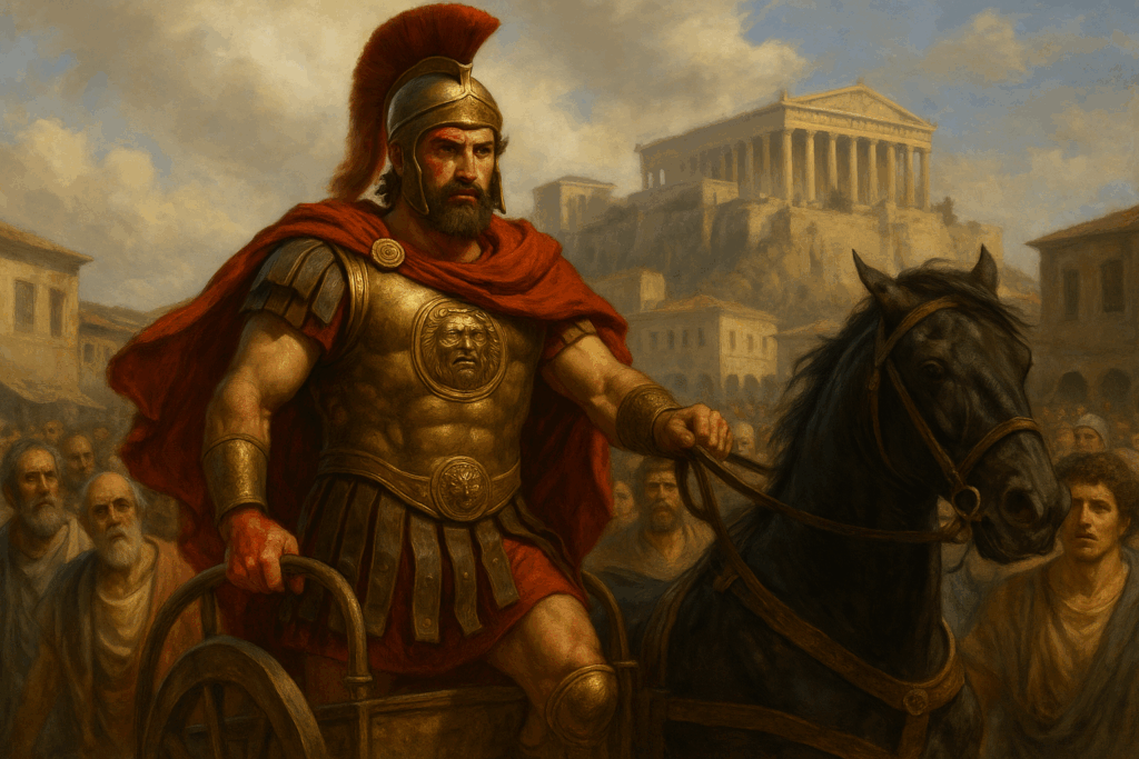PISISTRATUS IN ARMOR Pisistratus, dressed in ornate bronze armor with a crimson cape, rides a black horse-drawn chariot through the Agora. Behind him, citizens look on with awe and uncertainty as the Acropolis rises in the background, symbolizing his grip on Athens through both drama and strength.