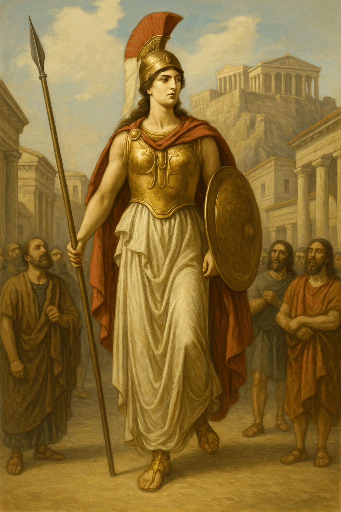 ATHENA RETURNS THE TYRANT A regal woman dressed in shining bronze armor and flowing white robes strides through Athens, bearing a spear and shield. Posing as the goddess Athena, she leads the way for Pisistratus’ return while stunned citizens watch in reverence, the Acropolis rising in the background.