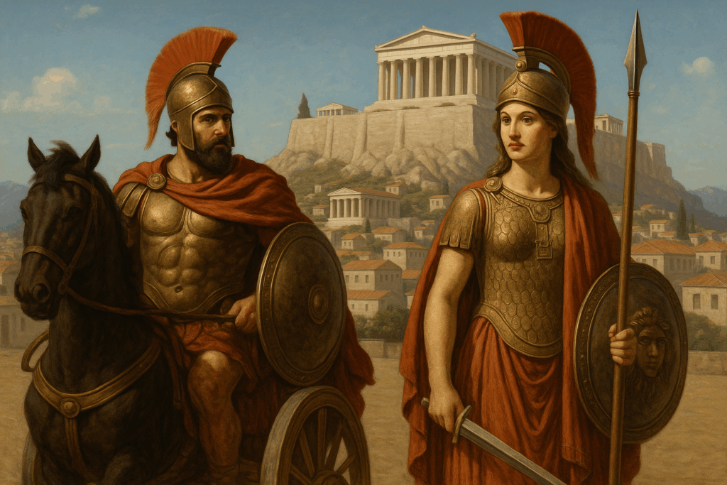PHYE AS ATHENA Phye, the tall Athenian woman chosen by Pisistratus, gazes directly at the viewer with quiet authority. Wearing ornate bronze armor and a crimson-plumed helmet, she stands in the heart of Athens with spear and shield in hand. Behind her, the Acropolis watches over the city—her presence blurring the line between mortal and divine.