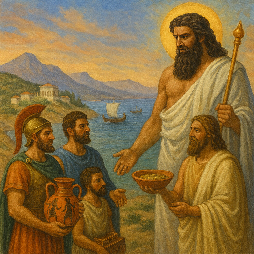 SOLON’S DREAM OF DEMOCRACY Solon addresses a diverse Athenian crowd beneath an olive tree, proclaiming the end of debt slavery and laying the groundwork for a more equitable civic life. The golden light and scrolls of law highlight his legacy as a visionary reformer.