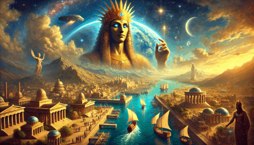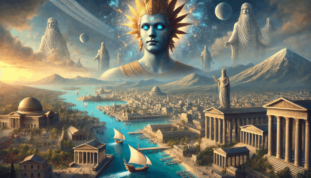 Anunnaki Influence over the Ancient Mediterranean Marduk, dignified and radiant, watches from the heavens as trade connects Greek, Phoenician, and Egyptian cities below