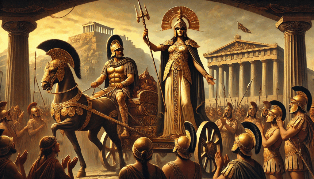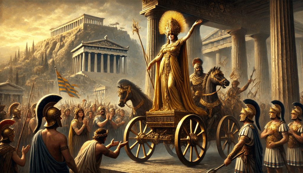 ATHENA RETURNS THE TYRANT Pisistratus re-enters Athens behind a woman dressed as the goddess Athena, staging divine approval to reclaim power. Citizens cheer, awed by the spectacle—a masterclass in ancient political theater.
