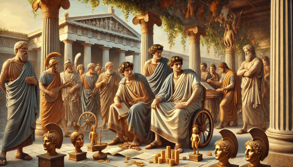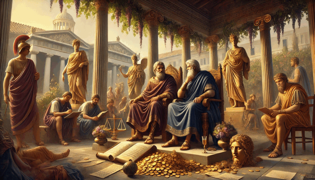 Title:THE SONS OF THE TYRANT Description: Hippias, stern and calculating, shares the throne with the flamboyant Hipparchus, surrounded by artists, philosophers, and golden statues, highlighting their brief golden era.